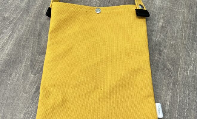 ほぼA4サイズの縦型ワンハンドルバッグです。 持ち手が着脱可能な片側ボタン止めになっているので他のバッグの持ち手につけて使うこともできます。軽く糊がついた、弱撥水タイプの帆布製で、さりげない「suzume」のタグ…