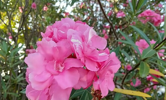 RN. フェアリーペンギン さん昨日は、与次郎にある病院に行ったのですが、街路樹の緑の中に色鮮やかなピンクの花が、目に飛び込んできました。「夾竹桃」だったのです。たくさんの夾竹桃が満開でした。ちなみに夾竹桃には毒があるそうです。毒…