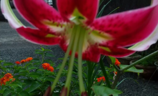 RN. 薩摩川内市ジャスミン さん曇天の朝です。ただいま五時すぎ、外のほうが涼しいです。昨夕はつぼみだったカノコユリが、一輪咲きました。真紅色のカノコユリが明るくしてくれます。DSC_0628…