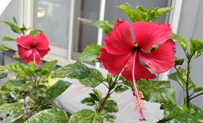 RN. 帰って来て!かめたろう さん今朝、庭のハイビスカスが2輪咲いていました。「スノーフレーク」という名前です。真っ赤な色と白が混ざった葉も可愛いですよ。…
