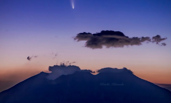 紫金山(しきんざん)•アトラス彗星が夕方の星空を賑わしています。皆さんご覧になりましたか?昨日の夕方、大隅方面から桜島とともに撮影してみました。桜島の火口に吸い込まれるような彗星、感動と興奮で手が震えました。肉眼でしっかり見えるぐらい明る…