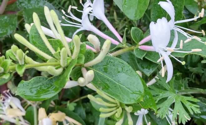 RN. ぼちぼちちゃん さんウォーキング中甘い香りが漂っています。スイカズラ発見‼️花の色が白から黄色になるので金銀花(きんぎんか)の別名があります。漢方薬にもなるそうです。DSC_0439…