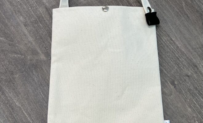ほぼA4サイズの縦型ワンハンドルバッグです。 持ち手が着脱可能な片側ボタン止めになっているので他のバッグの持ち手につけて使うこともできます。軽く糊がついた、弱撥水タイプの帆布製で、さりげない「suzume」のタグ…