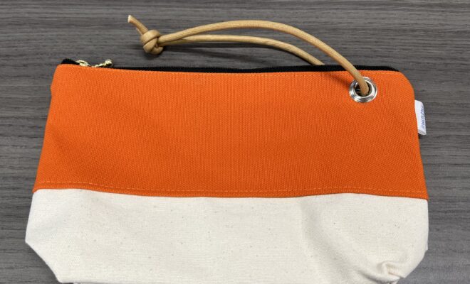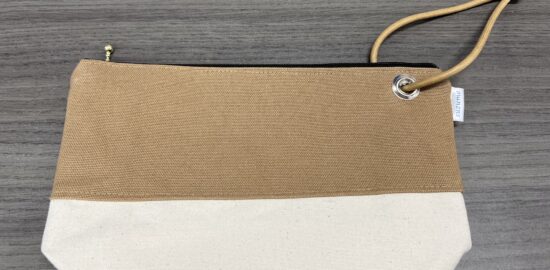 そのまま手首にかけてミニクラッチバッグとしてもバッグインバッグとしても使えるファスナー付きポーチ。中にはポケットもついているので、ちょっとした小物の整理にも活躍してくれそうです。軽く糊がついた、弱撥水タイプの帆布製…