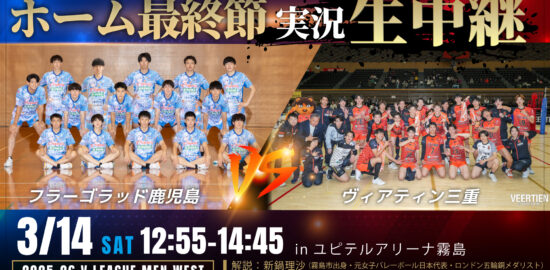 「勝ってプレーオフへ! Vリーグホーム最終節 フラーゴラッド鹿児島✕ヴィアティン三重」3月14日(土)ひる12時55分~実況生中継