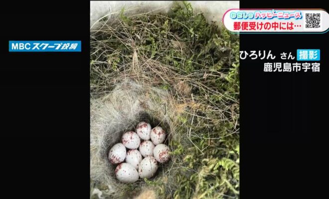 郵便受けの中に作られていたのは、鳥の巣。その中には9個の卵が産み落とされています。鹿児島市宇宿のペンネームひろりんさんが、先月中旬、自宅の玄関先の郵便受けでシジュウカラとみられる野鳥が巣作りをしているの…