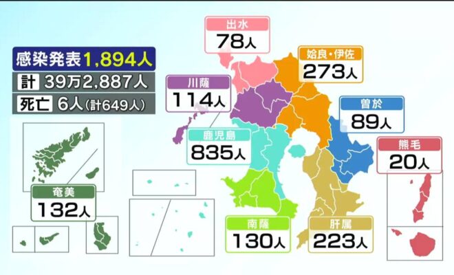 鹿児島県内では9日、新型コロナウイルスの感染者が新たに1894人発表されました。(医療圏別の内訳)鹿児島 835人姶良・伊佐 273人肝属 223人奄美 132人南薩 130人川薩 114人曽於 89人出水 78人熊毛 2…