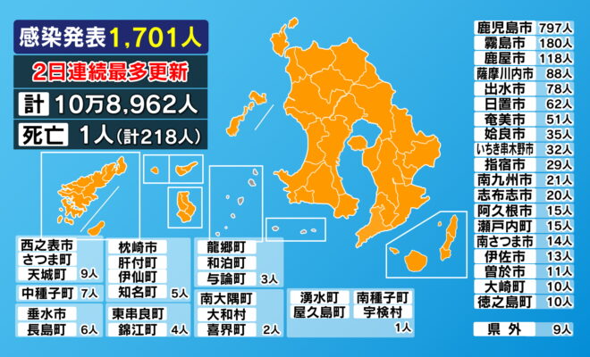 【市町村別詳細】新型コロナ感染者1701人 2日連続最多更新 鹿児島県