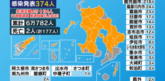 鹿児島県内では25日、新型コロナウイルスの感染者374人と、2人の死亡が発表されま…