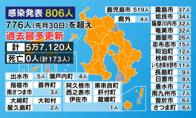 鹿児島県内では20日、新型コロナウイルスの感染者が新たに806人発表されました。初めて800人台となり、過去最多を更新しました。(内訳)鹿児島市519人霧島市37人姶良市34人薩摩川内市32人奄美市32人鹿屋市26…