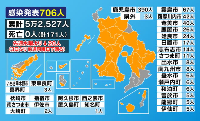 新型コロナ 市町村別詳細鹿児島県内では13日新型コロナウイルスの感染者が新たに706人発表され、3日ぶりに前の週の同じ曜日を下回りました。(市町村別内訳)鹿児島市 390人霧島市 67人薩摩川内市 42人奄…