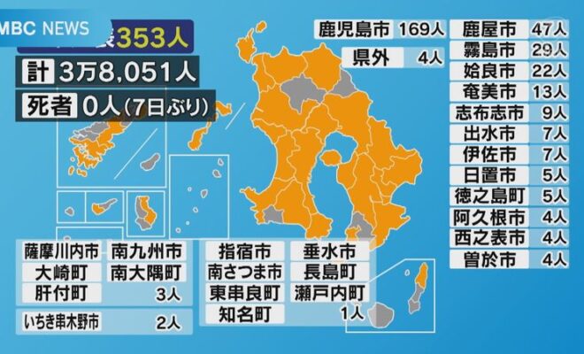 鹿児島県内では19日、新型コロナの感染者が、新たに353人発表されました。亡くなった人の発表は7日ぶりにありませんでした。新たに発表されたのは、鹿児島市169人鹿屋市47人霧島市29人姶良市22人奄美市13人志布志…