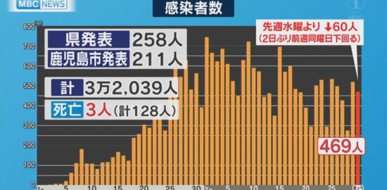 鹿児島県内では2日、新型コロナウイルスの感染者が新たに469人確認され、3人の死亡…