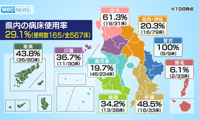 新型コロナの感染が急速に広がる中、鹿児島県内の病床使用率は29.1%と上昇し、30%に迫っています。また、医療圏別では出水が60%を超えました。19日時点で県内に567あるコロナ病床の使用率は29.1%となり、前の…