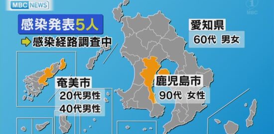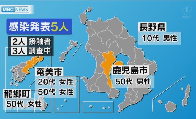 鹿児島県内では4日、新型コロナウイルスの感染者が新たに5人発表されました。感染が発表されたのは、奄美市の20代女性と50代女性、鹿児島市の50代男性、龍郷町の50代女性、長野県から県内を訪れている10代男性のあわせて5人で…