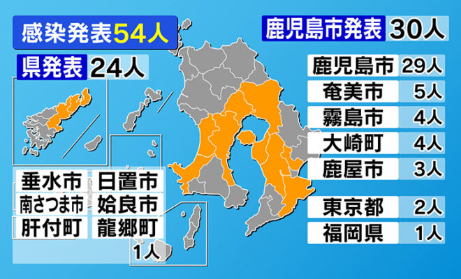 鹿児島県内では5日、新型コロナの感染者が新たに54人発表されました。また、1人の死亡が発表されました。新たに確認されたのは、県発表分の24人と、鹿児島市発表分の30人のあわせて54人で、100人を下回ったのは7日連続です。…