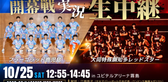 Vリーグ開幕戦「フラーゴラッド鹿児島×大同特殊鋼知多レッドスター」10月25日(土)ひる12時55分~実況生中継