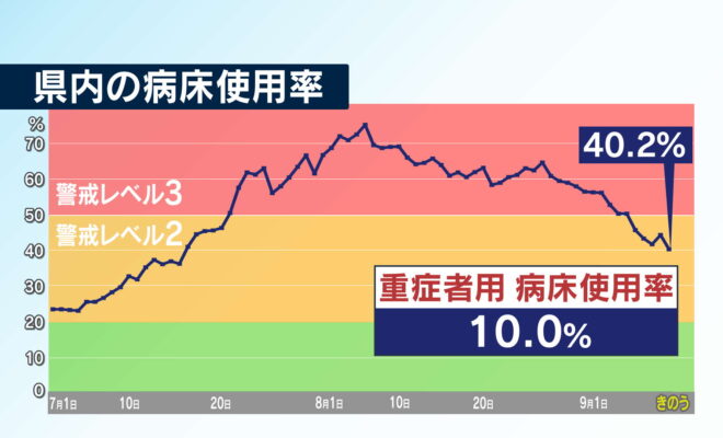 鹿児島県内の12日時点の新型コロナの病床使用率は、前日より4ポイント低い40.2%でした。県内の警戒基準でレベル2の目安となる20%以上の状況が続いています。一方で、重症者用病床の使用率は、前日より7.5ポイント低…