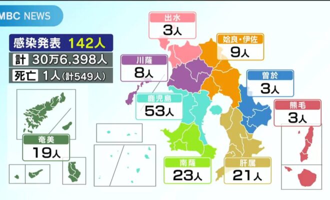 鹿児島県内では24日、新型コロナウイルスの感染者が新たに142人発表されました。(医療圏別の内訳)鹿児島53人南薩23人肝属21人奄美19人姶良・伊佐9人川薩8人出水3人曽於3人熊毛3人先週月曜日より4人多…