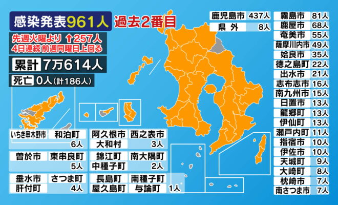 新型コロナ 鹿児島は過去2番目に多い961人