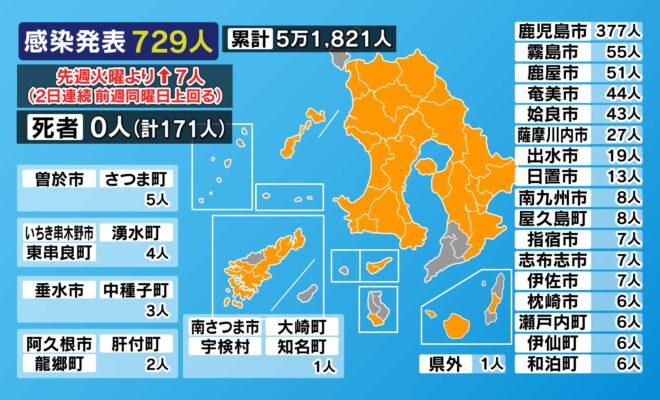 新型コロナ 鹿児島で729人感染 (市町村別詳細)
