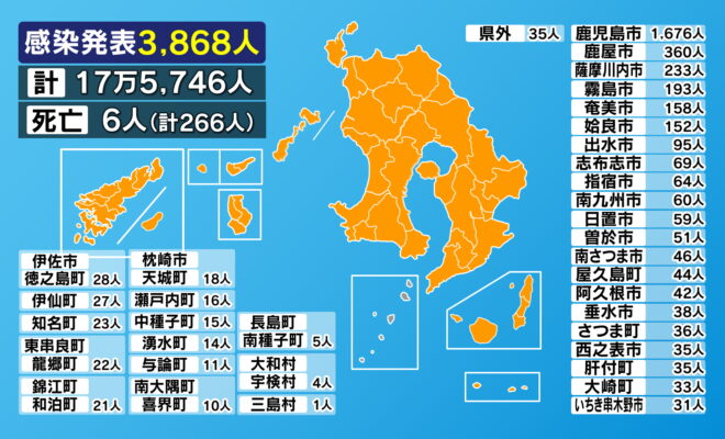 鹿児島県内で9日に発表された新型コロナウイルスの感染者は3868人で過去2番目に多くなりました。また、6人の死亡も発表されました。(内訳)鹿児島市1676人鹿屋市360人薩摩川内市233人霧島市193人奄美市158…