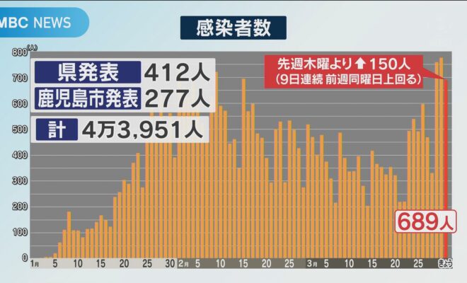 鹿児島県内で31日に発表された新型コロナウイルスの感染者は689人で、過去最多だったきのう30日を下回りました。ただ、感染拡大の傾向は続いていて、知事は緊急メッセージを発表して「第7波」への警戒感を示しました。新た…