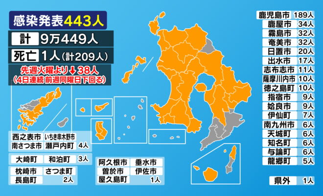 新型コロナ 鹿児島県で新たに443人 死者1人 クラスター3件