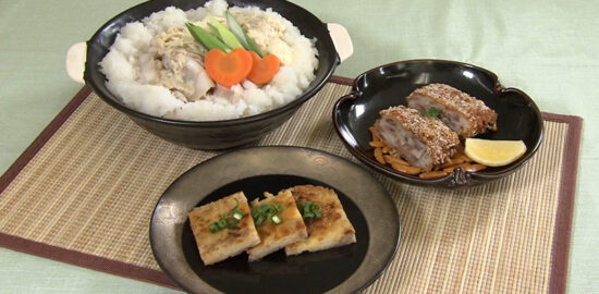「黒豚と健康豆腐のみぞれ鍋」と「柿の種の香ばしとんかつ」と「大根もち」を作ります。