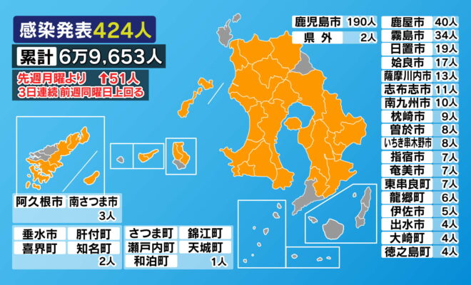 鹿児島県内では9日、新型コロナウイルスの感染者が新たに424人発表されました。(内訳)鹿児島市190人鹿屋市40人霧島市34人日置市19人姶良市17人薩摩川内市13人志布志市11人南九州市10人枕崎市9人曽於市8人…