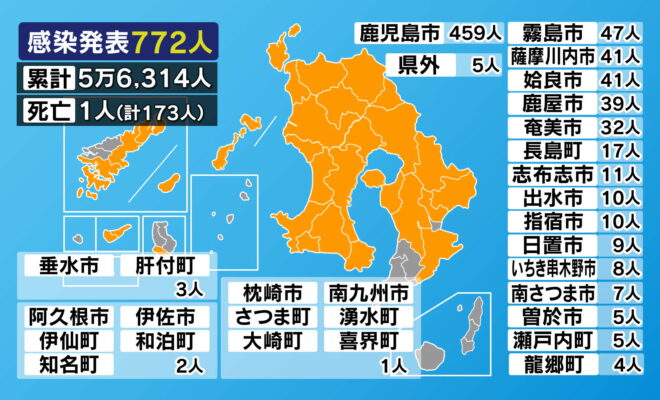 新型コロナウイルスの感染者は、鹿児島県内で19日、新たに772人発表されました。過去2番目に多い数です。(内訳)鹿児島市459人霧島市47人薩摩川内市41人姶良市41人鹿屋市39人奄美市32人長島町17人志布志市1…