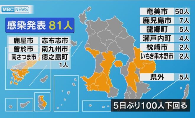 鹿児島県内では11日、新型コロナウイルスの感染者が新たに81人発表されました。感染が確認されたのは、奄美市50人、鹿児島市7人、龍郷町5人、瀬戸内町4人、枕崎市・いちき串木野市で2人ずつ、鹿屋市・曽於市・南さつま市・志布志…