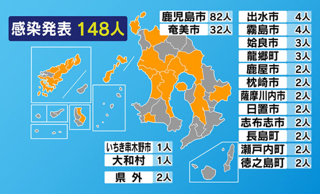 鹿児島県内では16日、新型コロナウイルスの感染者が新たに148人発表され、5日連続で100人を超えました。感染が確認されたのは、鹿児島市で82人、奄美市で32人、出水市と霧島市で4人、姶良市と龍郷町で3人、鹿屋市、枕崎市、…