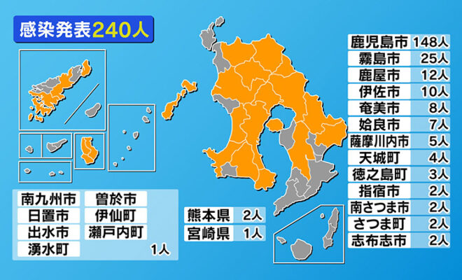 鹿児島県内では25日、新型コロナウイルスの感染者が240人発表され、4日ぶりに200人を超えました。感染者集団=クラスターの発生も相次いでいます。県内では25日、新型コロナの感染者が240人発表されました。内訳は、鹿児島市…