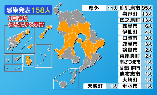 鹿児島県内では13日、新型コロナの感染者が158人確認され、3日連続で過去最多を更新しました。◆8月13日 新規感染者 158人・鹿児島市が95人・喜界町と徳之島町が13人ずつ・霧島市が6人・伊仙町が4人・日置市と鹿屋市が…