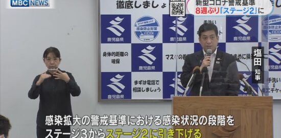 鹿児島県・新型コロナ警戒基準 8週ぶりに「ステージ2」に引き下げ