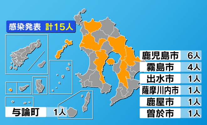 鹿児島県内では6日、新型コロナウイルスの感染者が新たに15人、また、死亡者が1人発表されました。感染が確認されたのは、鹿児島市の10歳未満から60代の男女6人、霧島市の40代から80代の男女4人、出水市の90歳以上の女性、…