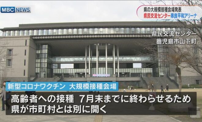 鹿児島県は、65歳以上を対象とした新型コロナワクチンの大規模接種会場を、鹿児島市の県民交流センターと鹿屋市の串良平和アリーナに設けると発表しました。新型コロナワクチンの大規模接種会場は、ワクチンの接種を希望する高齢者への接…