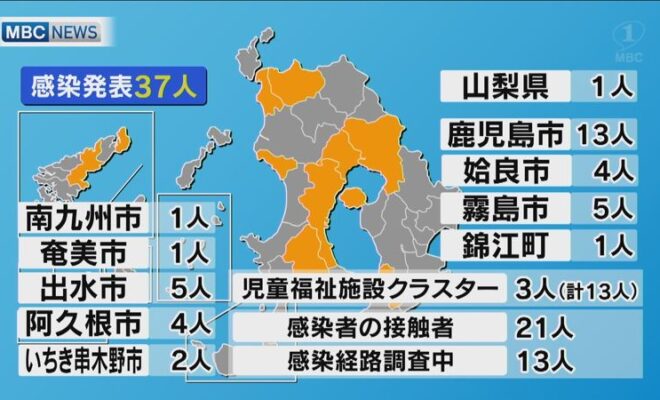 鹿児島県内では18日、新型コロナウイルスの感染者が37人発表されました。県内で感染が確認されたのは、10歳未満から80代の男女37人です。(鹿児島市で13人・阿久根市で4人・出水市で5人・いちき串木野市で2人・霧島市で5人…