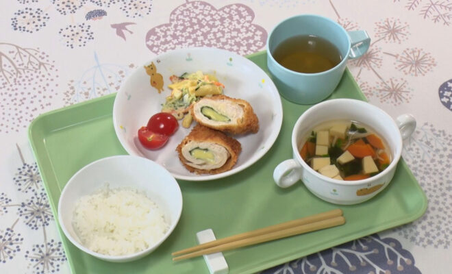 まいづるこども園の今日の給食「大葉とチーズのささみフライ」https://youtu.be/d--IQbNhiSo…