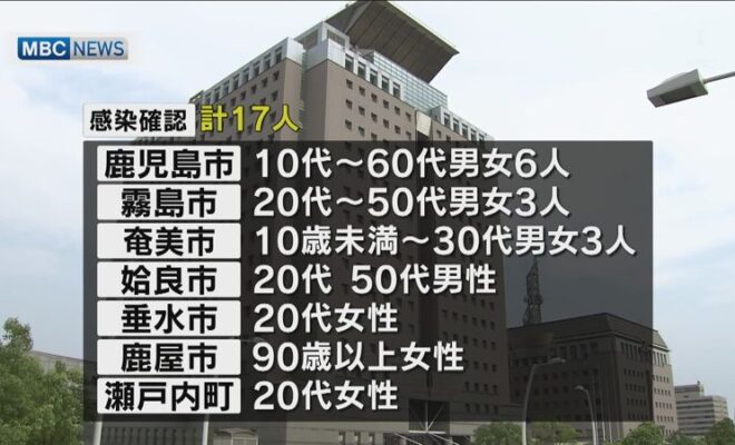 鹿児島県内では14日、新型コロナウイルスの感染者が17人発表されました。感染が確認されたのは、鹿児島市の10代から60代の男女6人、霧島市の20代から50代の男女3人、奄美市の10歳未満から30代の男女3人、姶良市の20代…