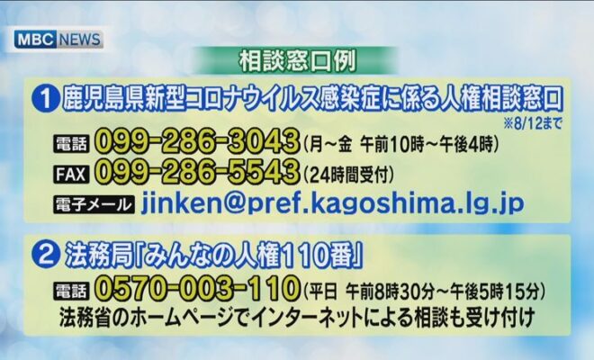 新型コロナウイルスの感染拡大に伴い、感染者や家族、職場の同僚、医療関係者への差別的な言動や、ひぼう中傷が報告されています。人権侵害を社会全体で防ぎましょう。自治体や法務局の人権相談窓口もご利用ください。鹿児島県はご覧の電話、ファッ…
