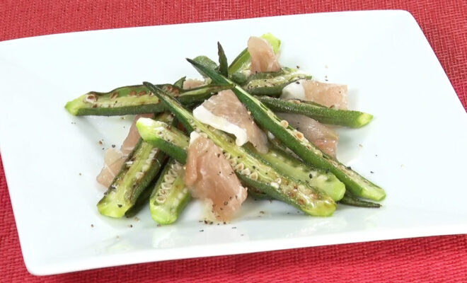 生産量日本一の鹿児島のオクラを使った料理を紹介します!料理講師の本田かおりさん。リモートでお料理を教えてもらいました。「焼きオクラの生ハム添え」を作ります。旬を迎えたオクラに一手間加えるだけで、オクラの旨味をより感…