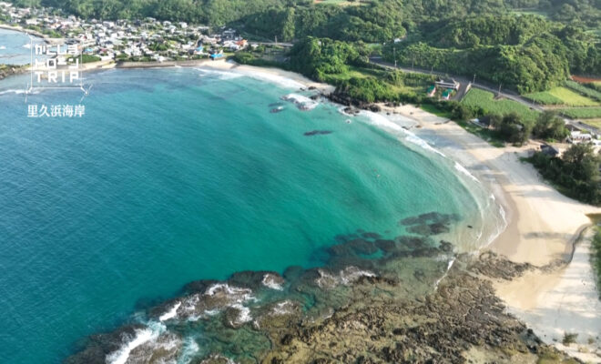 今回の舞台は大島郡徳之島町花徳。 島の北東に位置する里久浜海岸は、白い砂浜が緩やかな弧を描くように広がります。