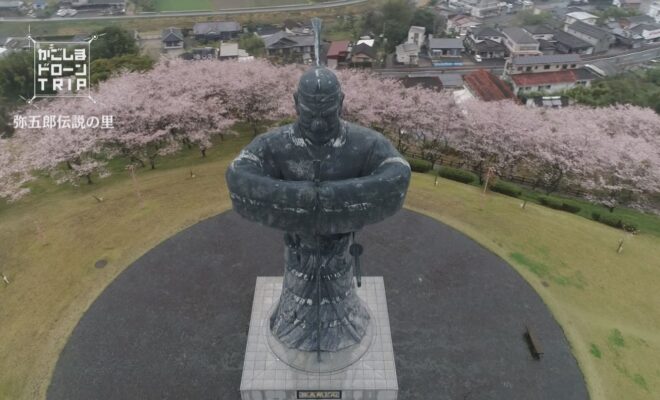 今回の舞台は、曽於市大隅町岩川。 高さ15mの巨大な弥五郎どん銅像がそびえ立つ弥五郎伝説の里は桜の名所としても有名。