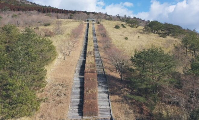 今回の舞台は、姶良郡湧水町木場。 栗野岳の中腹には、昭和63年に廃線になった旧国鉄の枕木を利用した階段が続きます。