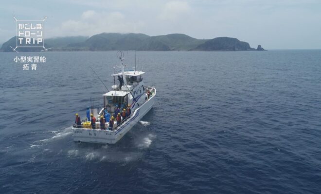 今回の舞台は、屋久島町口永良部沖。 海に浮かんでいるのは、鹿児島水産高校の小型実習船・拓青。鹿児島水産高校の生徒たちは、口永良部沖や三島村の黒島近海でカツオの一本釣り実習を行います。