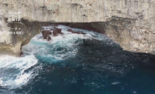 今回の舞台は、大島郡和泊町国頭。 沖永良部島の北側の海岸にフーチャと呼ばれる潮吹き洞窟があります。風が強く、波の高い日には、打ち寄せる波がぶつかり、岩壁に空いた穴から高く吹き上がります。