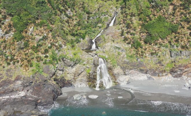 今回の舞台は、大島郡瀬戸内町嘉徳。奄美大島の南東に位置する篠穂の滝は、太平洋に面した断崖を海に向かって流れ落ちる珍しい滝。ゴツゴツとした岩肌を流れるその姿は圧巻。緑が覆い茂る岩山と青い海をつなぐように流れる滝を上空から眺める空の旅へと案内します。