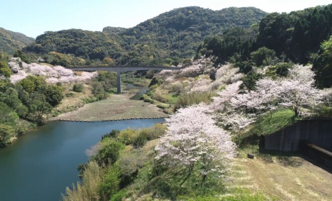 今回の舞台はいちき串木野市生福の串木野ダム。 五反田川上流に位置する串木野ダム周辺では、例年3月下旬~4月上旬におよそ1,000本の桜が見ごろを迎え、木々の緑と桜の花のコントラストを作り出します。